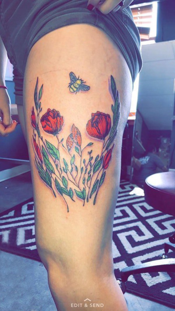 女生大腿上彩绘简单线条植物花朵和蜜蜂纹身图片