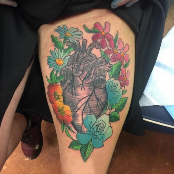 女生大腿上彩绘水彩素描创意文艺唯美花朵心脏纹身图片