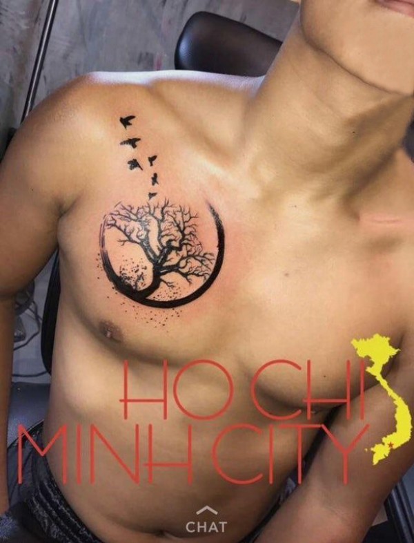 男生胸口上黑色线条素描创意文艺树纹身图片