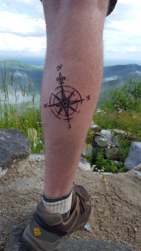 男生小腿上黑色点刺几何线条指南针纹身图片