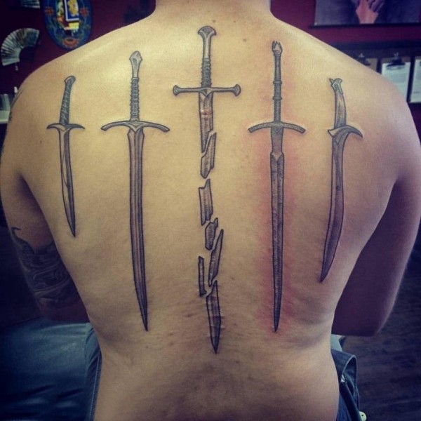 男生后背上黑灰点刺抽象线条创意剑纹身图片