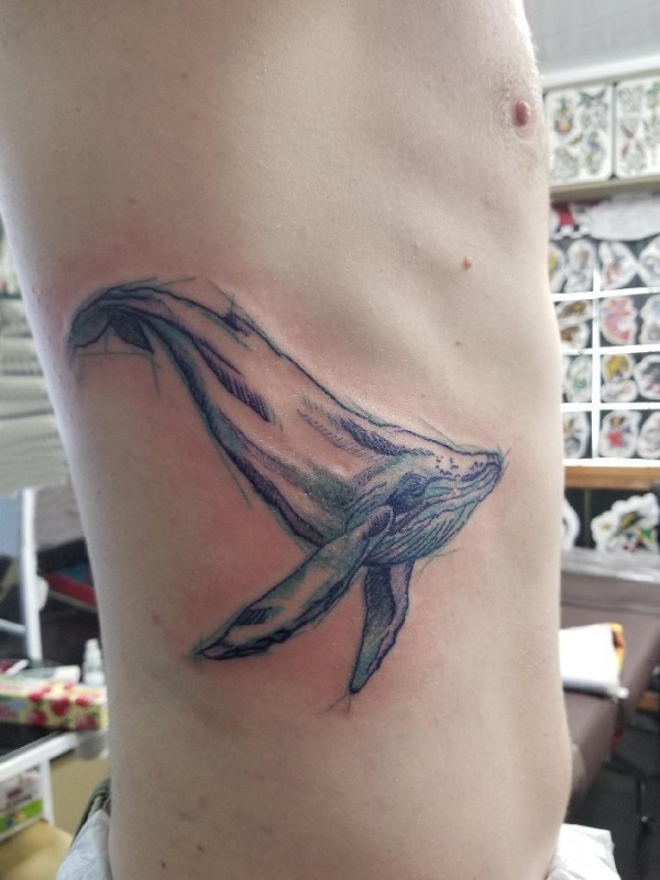 男生侧腰上黑灰点刺抽象线条动物鲸鱼纹身图片