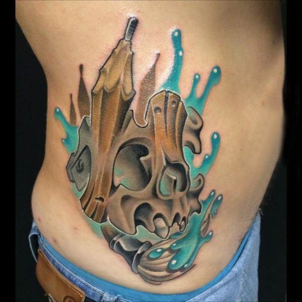 男生侧腰上彩绘水彩素描创意树枝纹身图片