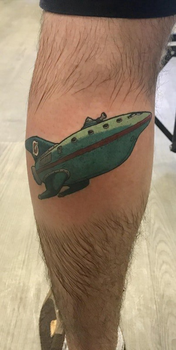 男生小腿上彩绘简单线条创意潜艇纹身图片