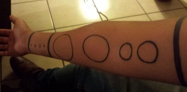 男生手臂上黑色几何简单线条圆形和手环纹身图片