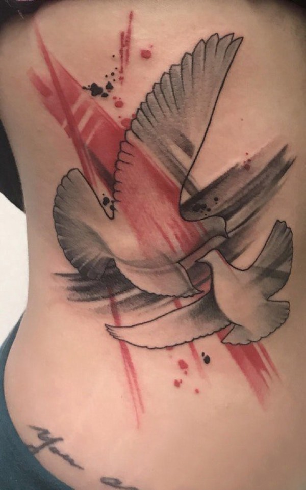 女生侧腰上彩绘点刺技巧简单线条小动物白鸽纹身图片