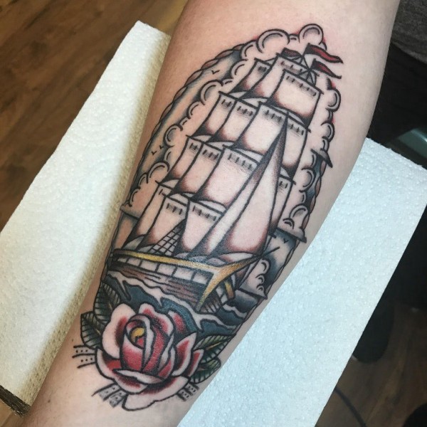 男生手臂上黑灰素描点刺技巧创意帆船精美纹身图片