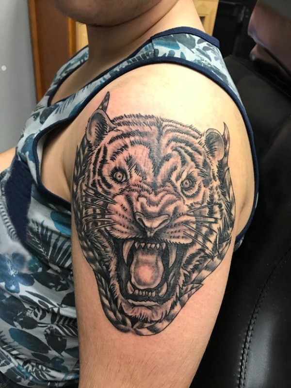 男生手臂上黑灰素描点刺技巧创意霸气老虎头纹身图片