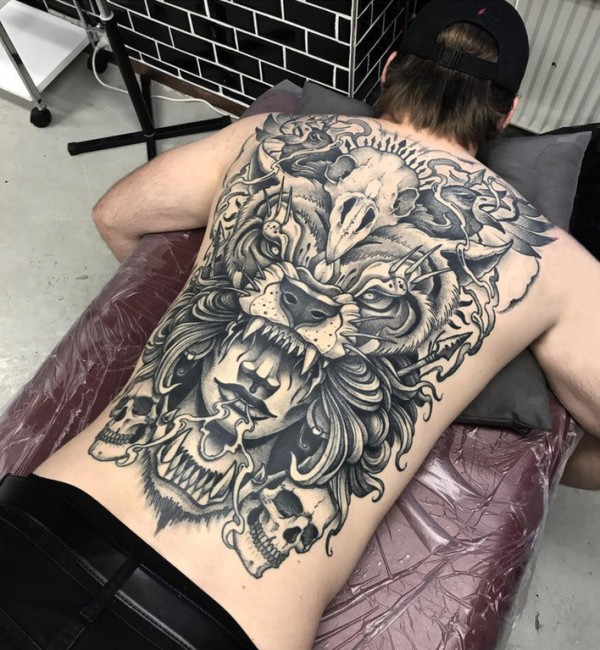 男生后背上黑灰点刺抽象线条老虎骷髅和人物纹身图片