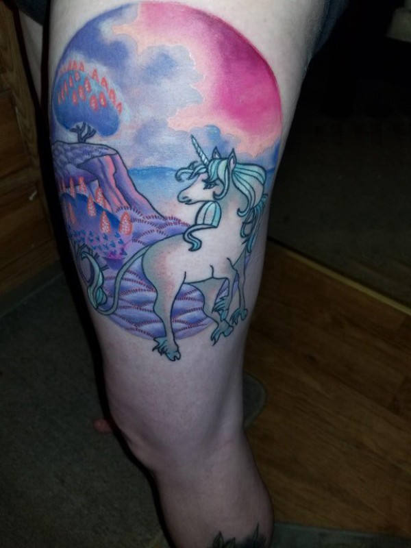 男生大腿上彩绘渐变植物大树和独角兽纹身图片