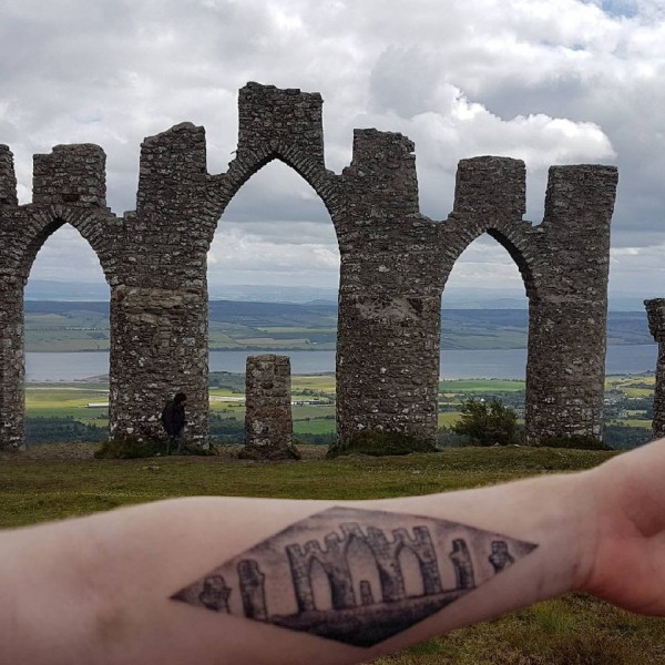 女生手臂上黑灰素描点刺技巧创意写实建筑风景纹身图片