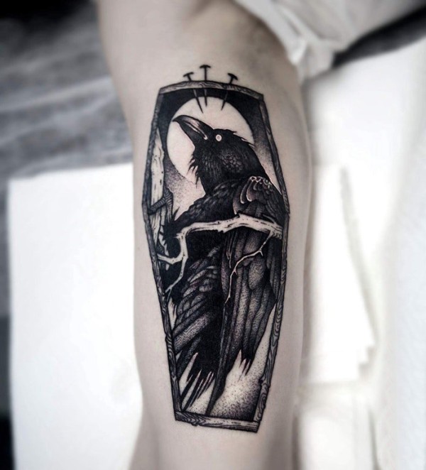 男生小腿上黑灰素描点刺技巧创意小鸟纹身图片