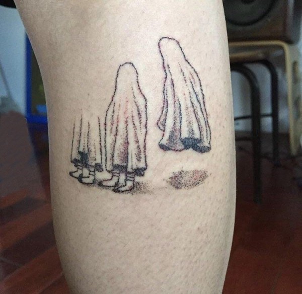 男生小腿上黑灰素描点刺技巧创意幽灵恐怖纹身图片