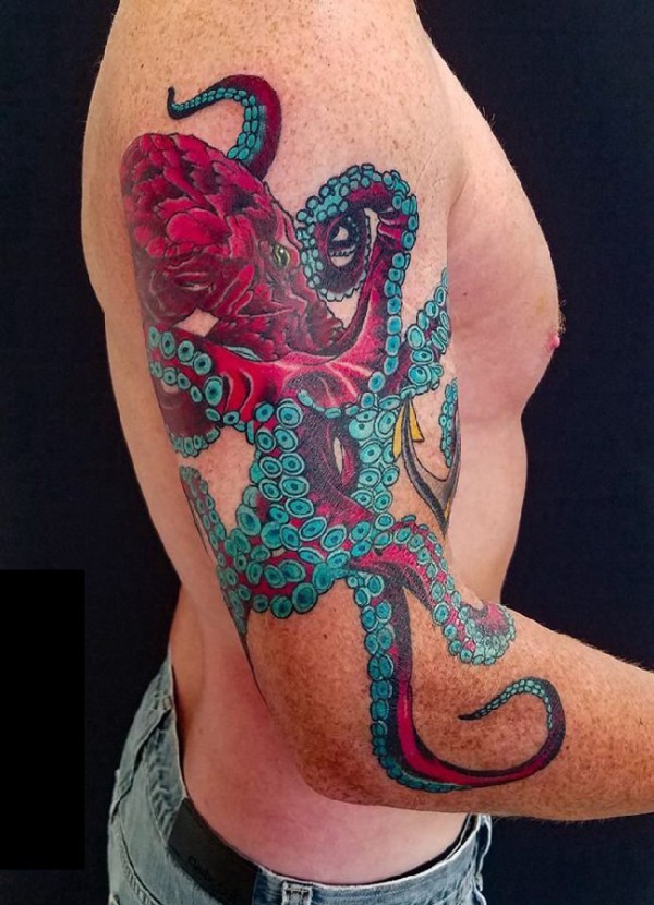 男生手臂上彩绘几何个性线条动物章鱼纹身图片