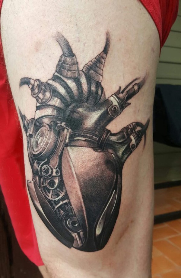男生大腿上黑灰点刺简单线条创意机械心脏纹身图片