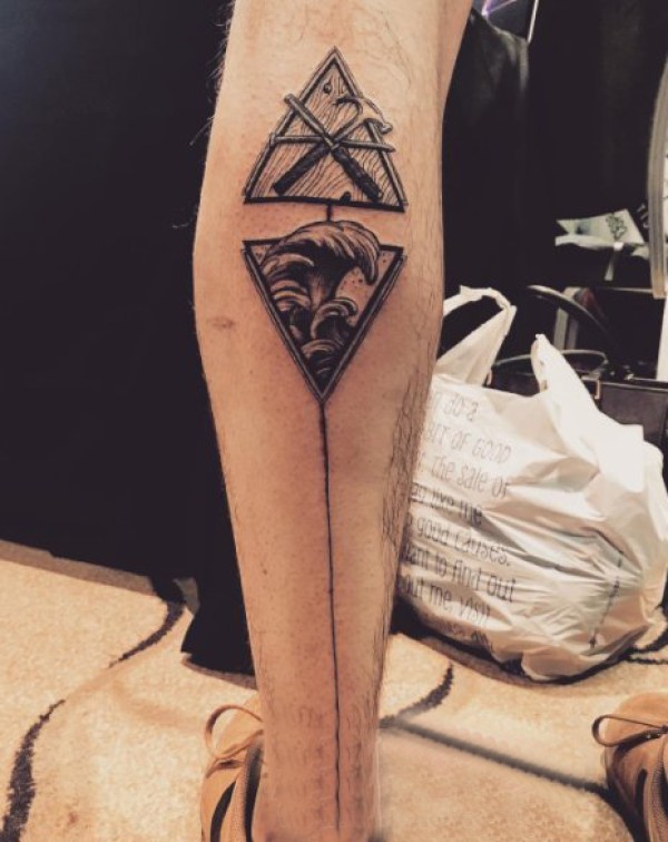 女生小腿上黑灰素描点刺技巧创意几何元素浪花纹身图片