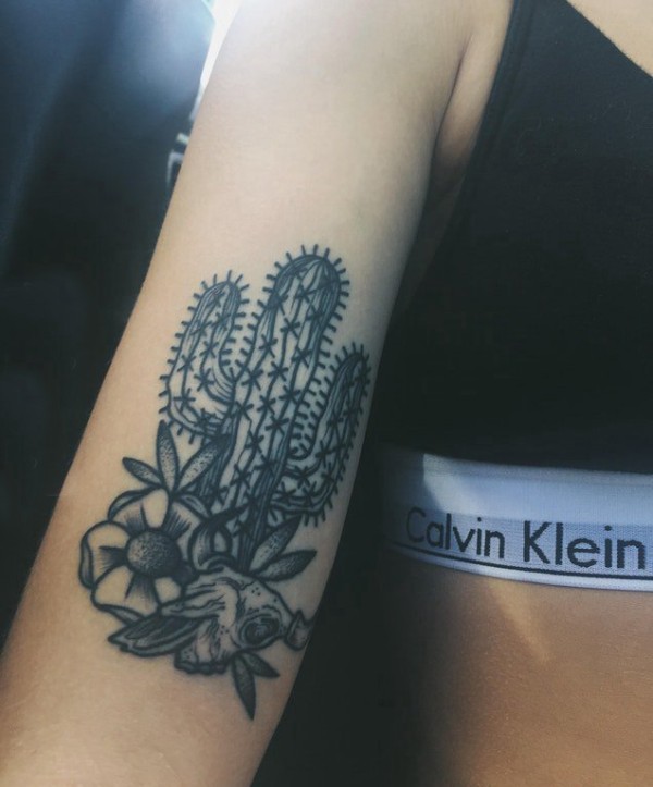 女生手臂上黑灰素描点刺技巧创意文艺仙人掌纹身图片
