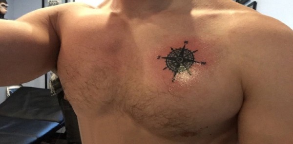 男生胸部黑色点刺几何线条简单的指南针纹身图片