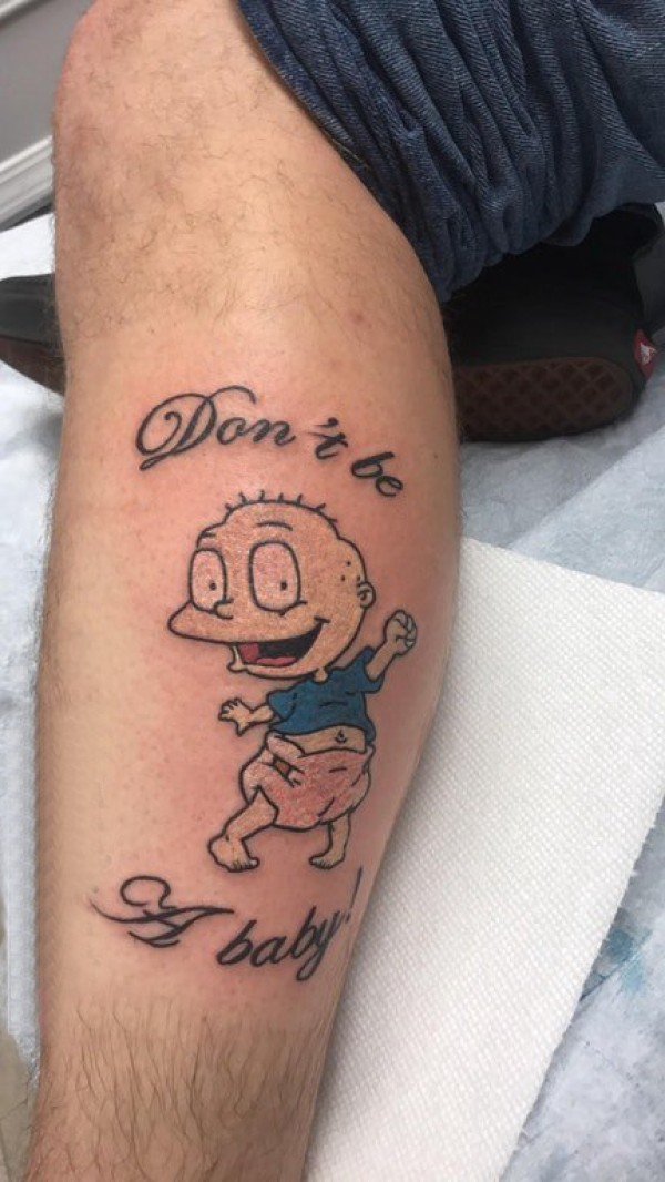 男生小腿上彩绘简单抽象线条英文和卡通人物纹身图片
