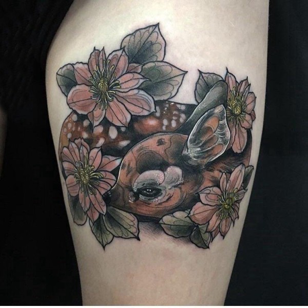 女生大腿上彩绘抽象线条植物花朵和动物鹿纹身图片