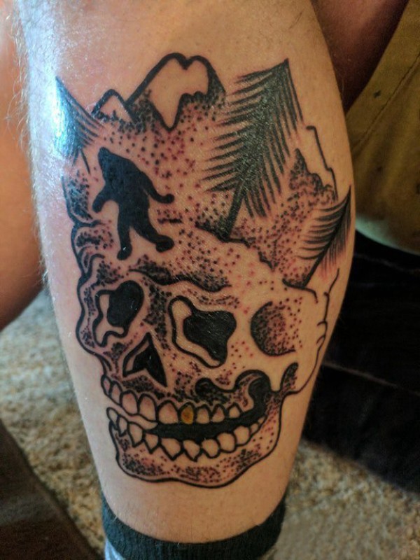 男生小腿上黑灰素描点刺技巧创意骷髅纹身图片