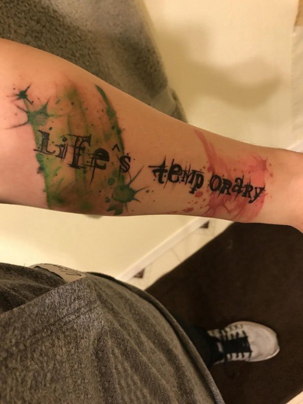 男生手臂上黑色线条创意文艺花体英文水彩泼墨纹身图片