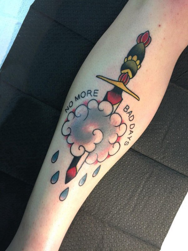 男生手臂上彩绘水彩素描创意云朵匕首纹身图片