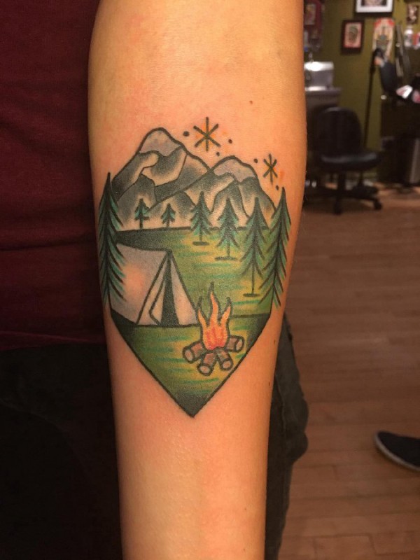 男生手臂上彩绘水彩素描文艺风景复古纹身图片