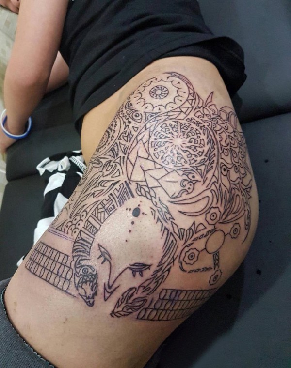 女生侧臀上黑色几何抽象线条创意纹身图片