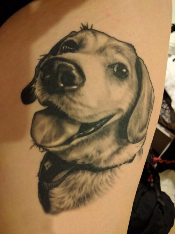 男生侧腰上黑灰点刺简单线条小动物狗纹身图片