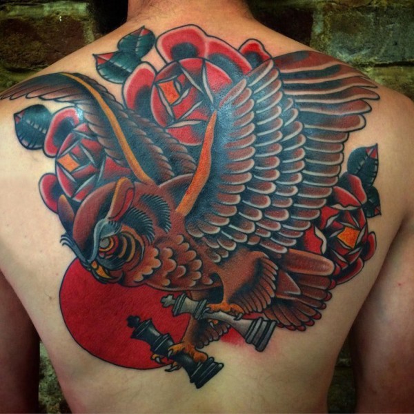 男生后背上彩绘植物花朵和动物老鹰纹身图片