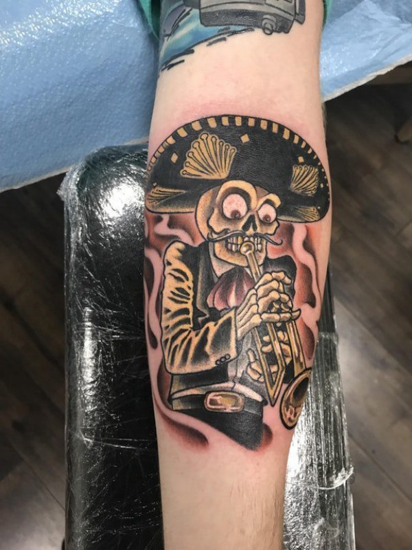 男生手臂上彩绘渐变抽象线条骷髅音乐家纹身图片