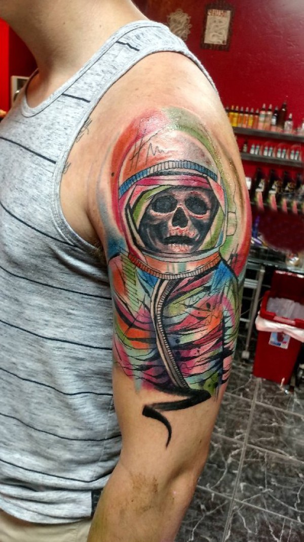 男生手臂上彩绘抽象线条骷髅宇航员纹身图片