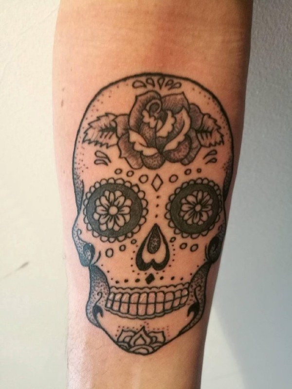 男生手臂上黑色点刺简单线条花朵和骷髅纹身图片