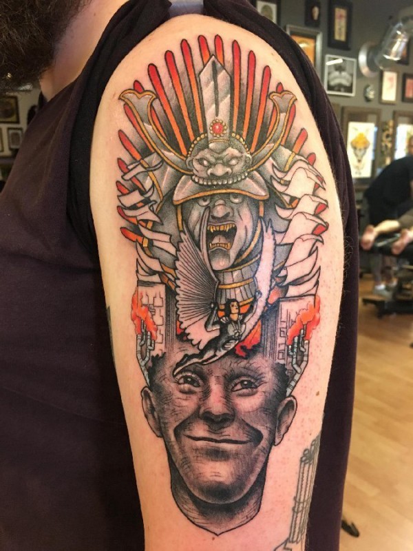 男生手臂上彩绘水彩素描创意印第安风格恐怖人物纹身图片