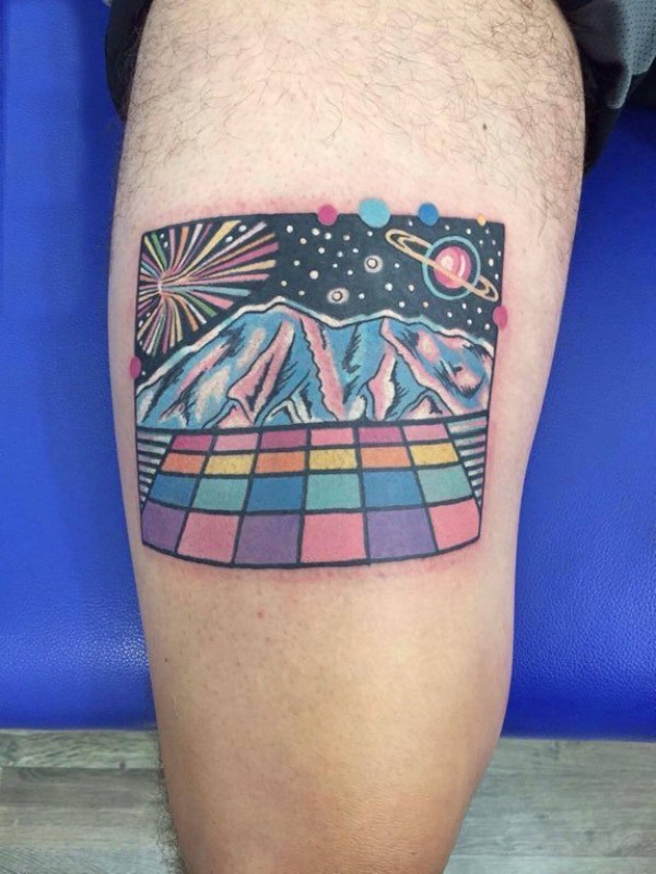 男生大腿上彩绘几何抽象线条山脉纹身图片