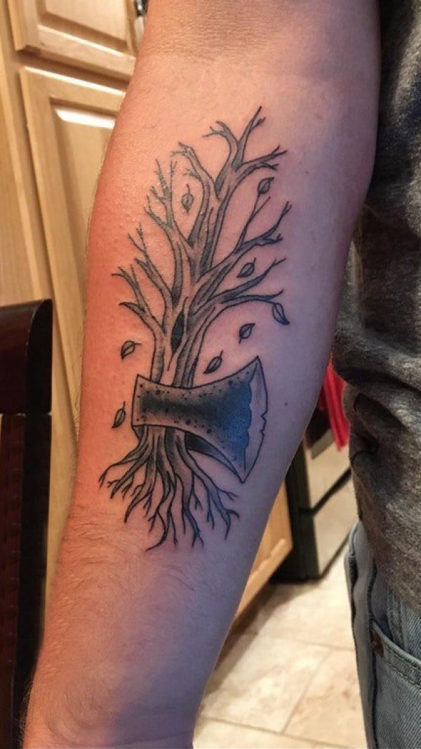 男生手臂上黑灰素描点刺技巧创意树枝纹身图片