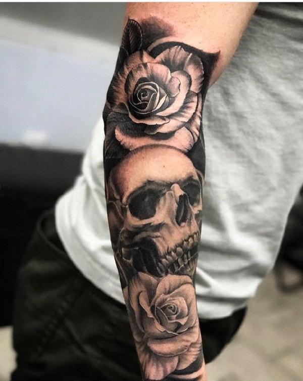 男生手臂上黑灰素描点刺技巧创意恐怖骷髅玫瑰纹身图片