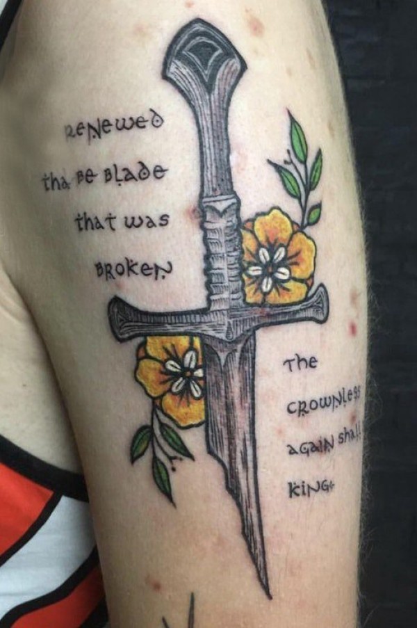 男生手臂上彩绘渐变植物花朵和匕首纹身图片