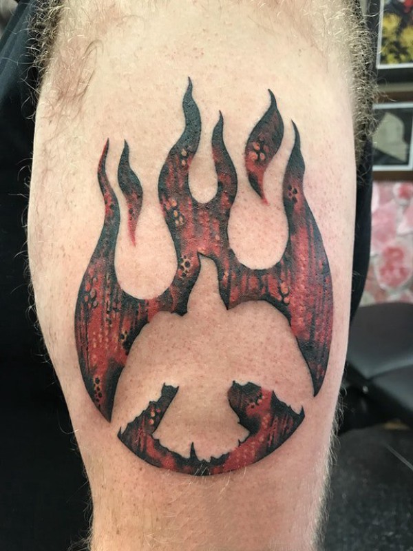 男生大腿上彩绘渐变抽象线条火焰纹身图片