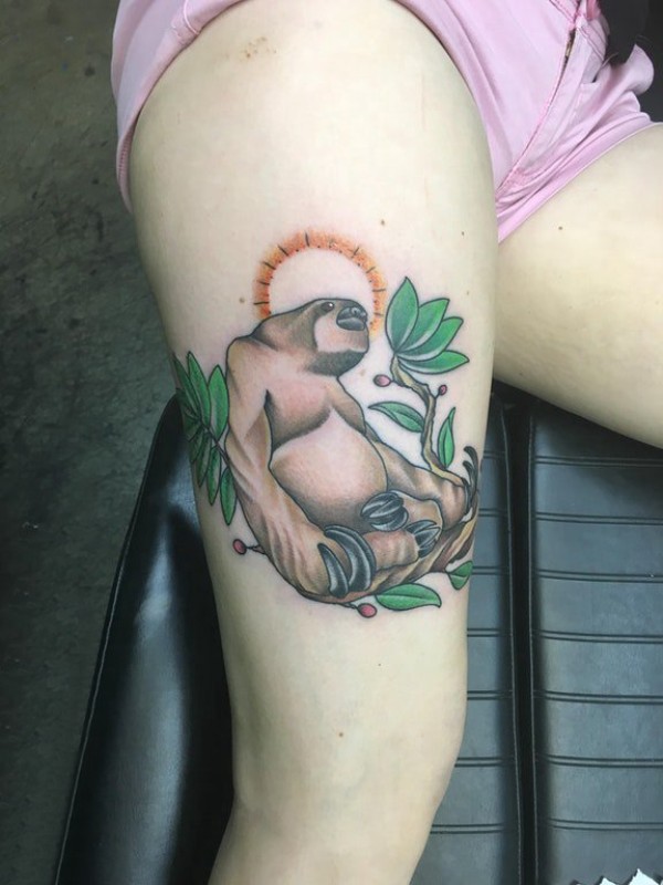 女生大腿上彩绘简单线条植物和动物猩猩纹身图片
