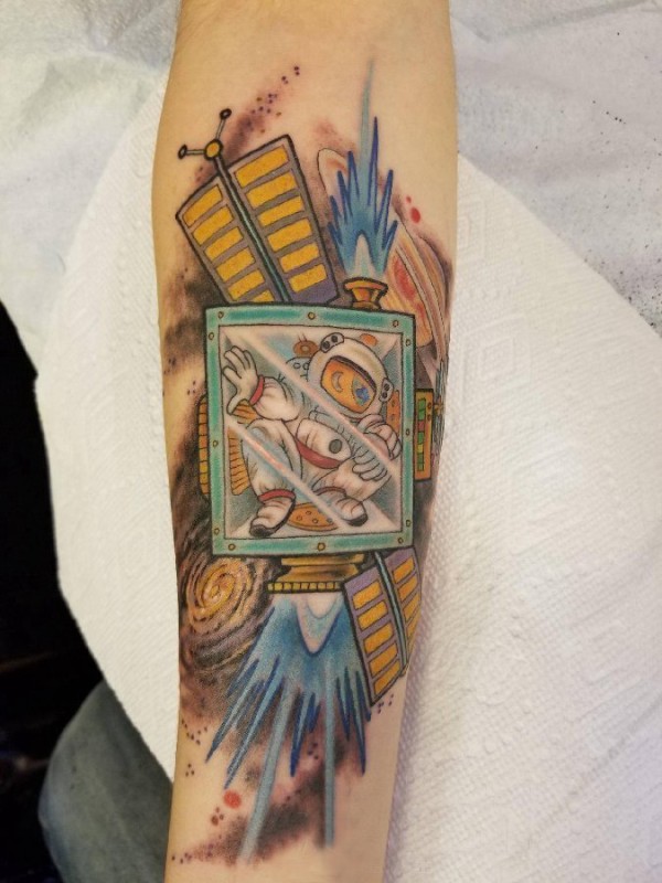 女生手臂上彩绘几何线条创意卡通人物宇航员纹身图片