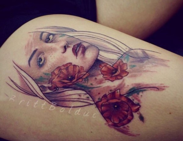 女生大腿上彩绘渐变植物花朵和简单线条人物肖像纹身图片