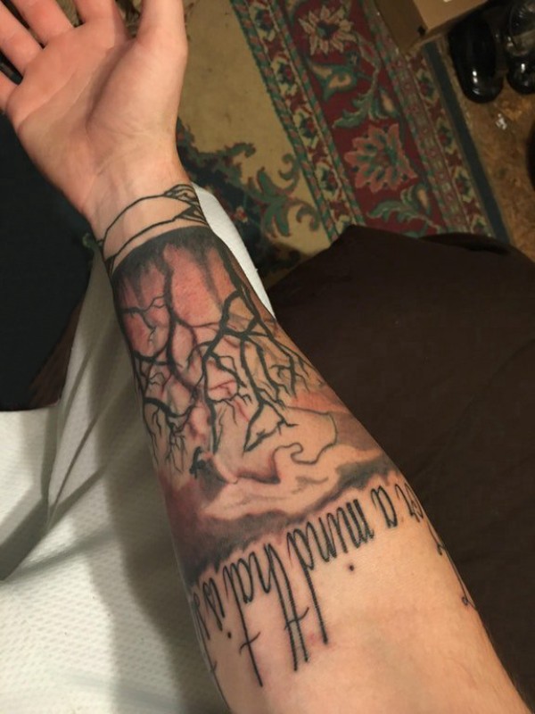 男生手臂上彩绘渐变抽象线条英文和大树纹身图片