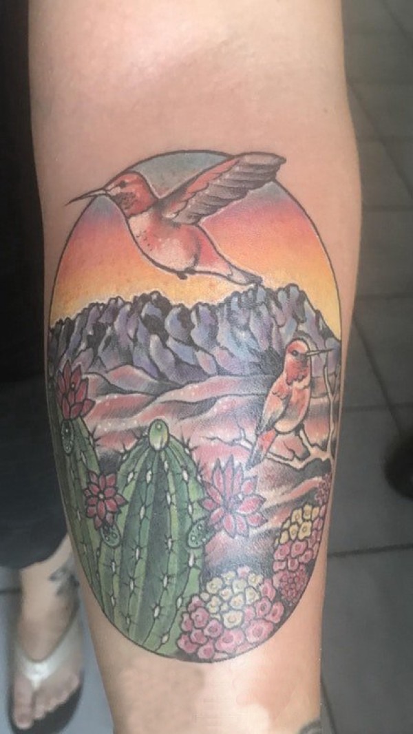 男生手臂上彩绘渐变简单线条山脉和植物纹身图片