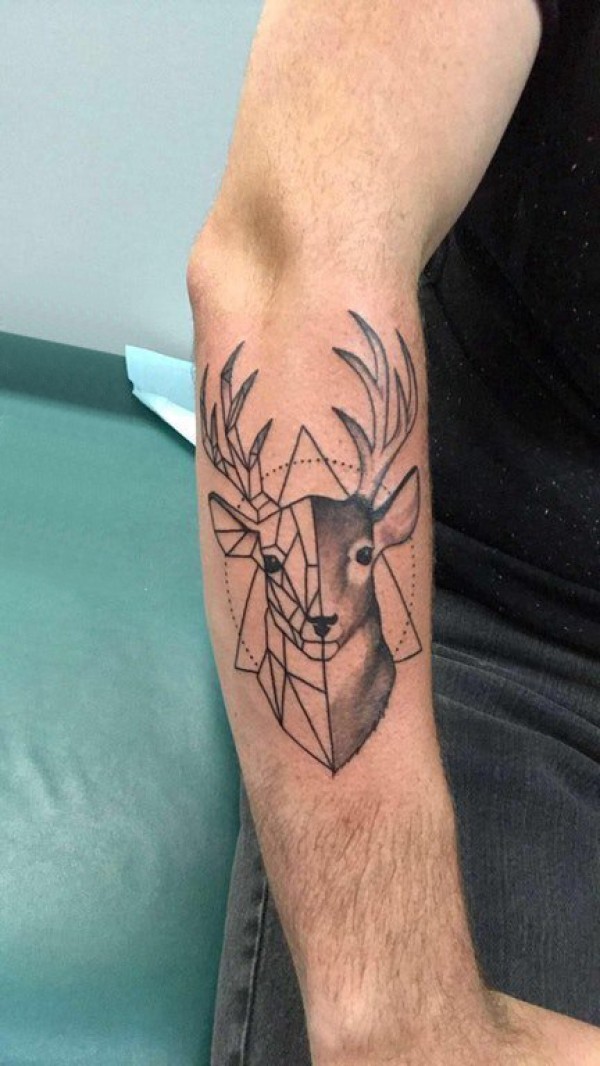 男生手臂上黑灰点刺几何简单线条拼接小动物鹿纹身图片