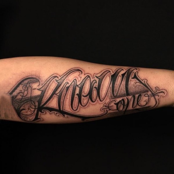 中国有嘻哈TT手臂上花体英文纹身图片