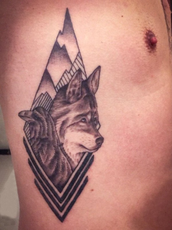 男生侧腰上黑灰素描点刺技巧创意狼纹身图片