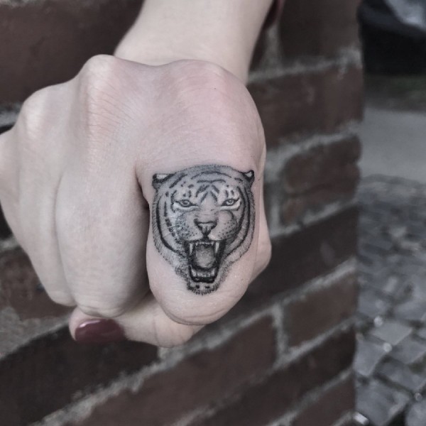 女生手指上黑色素描创意恐怖老虎纹身图片