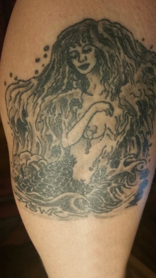 男生小腿上黑灰点刺抽象线条人物美人鱼纹身图片